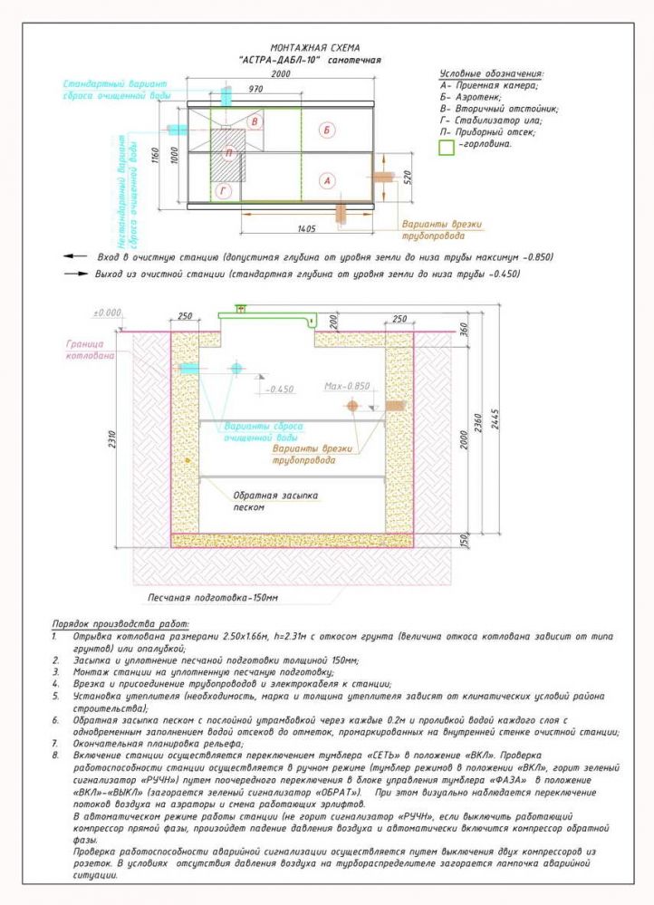 Для начала нужно выкопать котлован по размерам на 20 см больше, чем сама установка Юнилос Астра 10. Далее подготавливается песчаная подушка на его дне. На следующем этапе выполняется копка траншей, прокладка электрического кабеля и подводящей трубы в них, а сама станция опускается на дно, также устанавливается компрессор и подключаются инженерные коммуникации. На следующем этапе септик обсыпается песком с попеременным заполнением водой. Проводятся пусконаладочные работы.