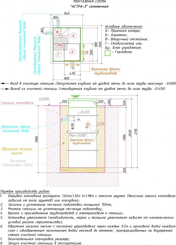 3. Котлован копается величиной на 25 см больше, чем габаритные размеры станции. Емкость полностью опускается в него, траншеи бетонируются и утепляются.