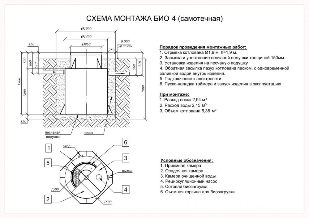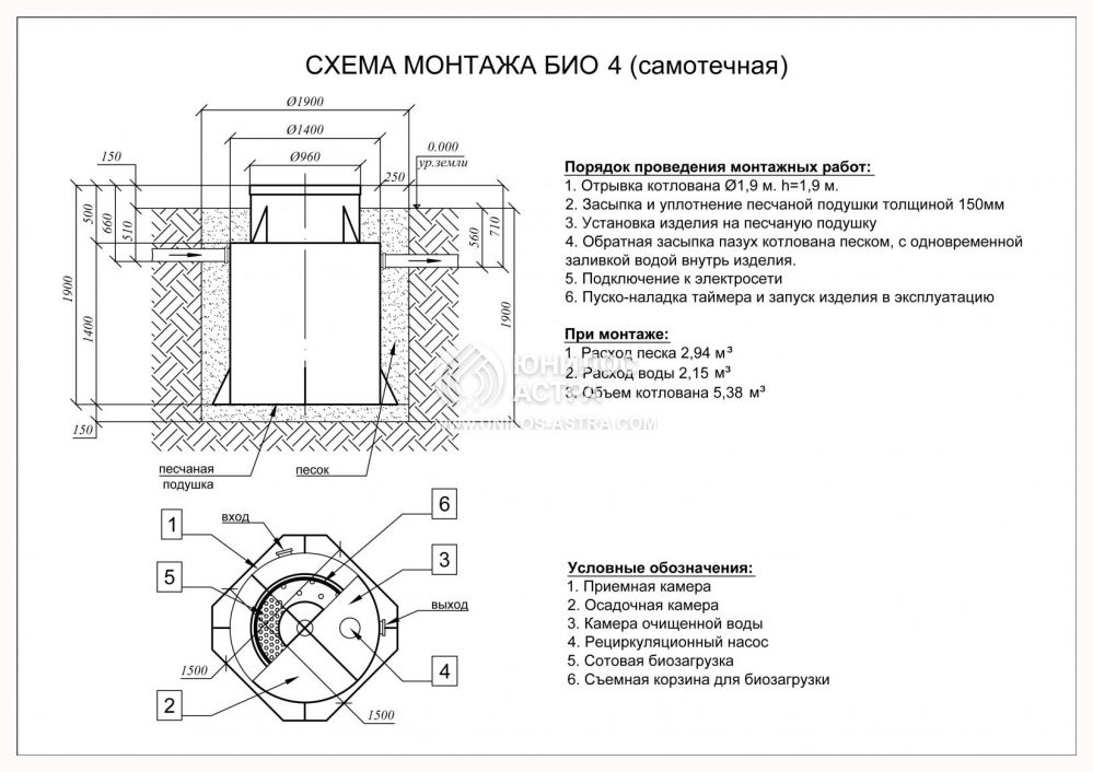 Для начала выкапывается котлован на 15-20 см больше, чем размеры самой установки, и траншеи для электрического кабеля и врезки подводящей трубы. Далее септик Астра 4 опускается в котлован, к нему подводится труба и электрический кабель. После этого устройство обсыпается со всех сторон песком с попеременным заполнением водой. На заключительном этапе выполняются пусконаладочные работы.