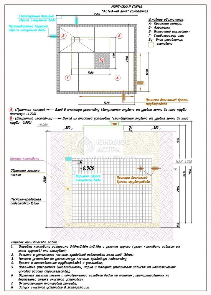 Функционирование септика Юнилос Астра 40 Long происходит в 7 этапов. За очищение воды отвечает несколько камер, которые обрабатывают жидкость и удаляют грязь на 98%. Рассмотрим все этапы: